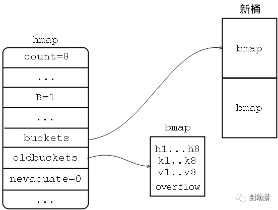 翻倍扩容分配新桶数目是旧桶的2倍,hmap.oldbuckets指向旧桶,hmap.buckets指向新桶。hmap.nevacuate为0,表示接下来要迁移编号为0的旧桶。